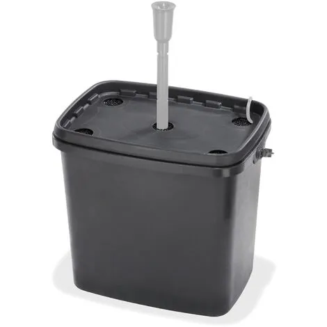 Lorsque la pompe fonctionne, leau sécoule par le haut à travers les éponges filtrantes individuelles et les filets avec des pierres ou un matériau filtrant (filets sans pierres ni matériau filtrant) vers la pompe. Leau filtrée du bassin est ensuite renvoyée vers le bassin via les arroseurs.
