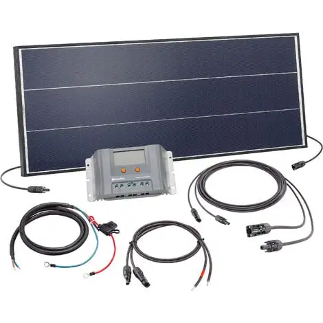 Contenu de la livraison : 1 x module solaire avec technologie de bardeau innovante et cadre en aluminium environnant, 1 x contrôleur de charge 30 A avec écran LCD, 1 jeu de câbles de module solaire avec 5 m de longueur de câble, 1 jeu de câbles adaptateurs de 0,5 m avec extrémités de câble ouvertes pour connecter le câble du module solaire au contrôleur de charge et un 1,5 m long câble de batterie avec fusible pour connecter le contrôleur de charge à la batterie.