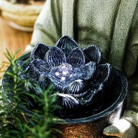 Grâce à son design spécial, la fontaine décorative de jardin Bouddha avec LED a lair antique. Lorsque le crépuscule tombe le soir, leau ondulée de la fleur de lotus peut être particulièrement bien observée grâce à la LED intégrée. Tout ce que vous avez à faire est de vous asseoir avec un verre de vin ou un livre et de profiter de la détente que vous méritez.
