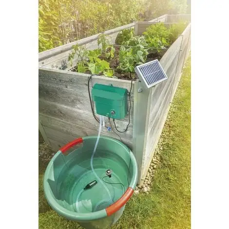 Inclut 15 supports et busesS’allume automatiquement 2 x par jourIntervalle réglable de 0,5 à 5 litres par irrigationExtrait l’eau d’un baril, d’un étang ou d’un seau de pluie, par exemple