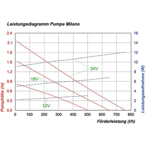 - Hauteur de refoulement à 12 V : max. 0,8 m, à 24 V : max. 2 m